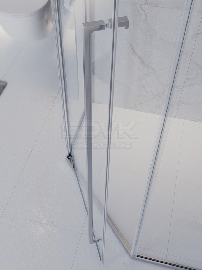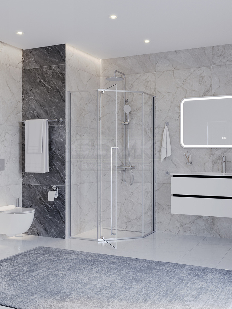 Душевой уголок PLANE с пятиугольной геометрией в сочетании прозрачного стекла и хрома — это идеальный баланс между функциональностью и эстетикой, подходящий для любого интерьерного решения.