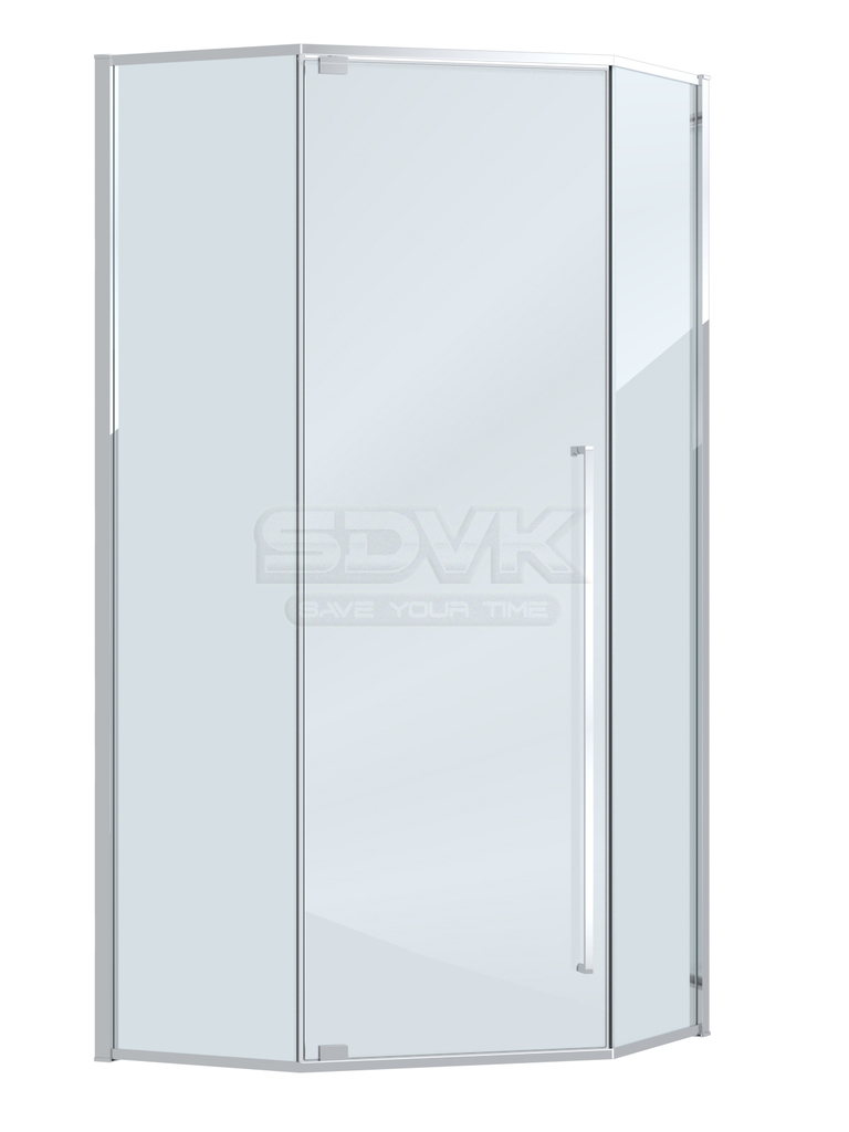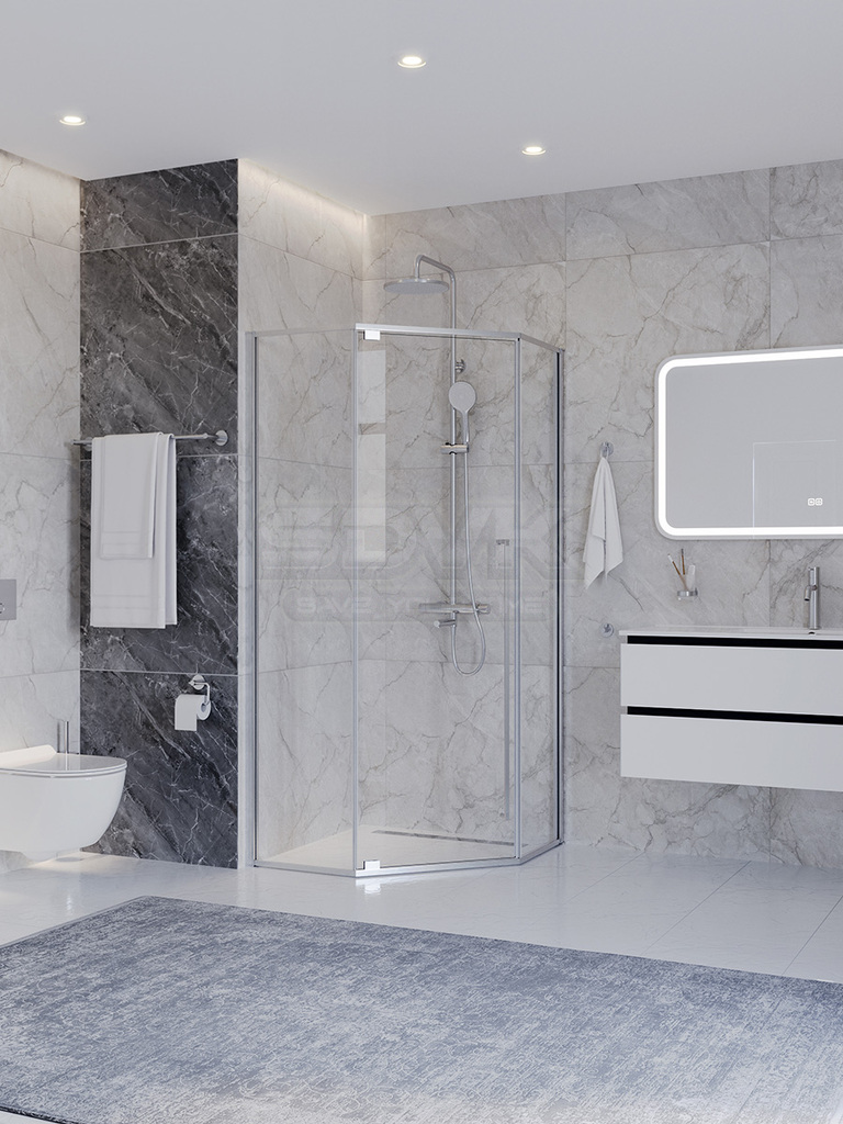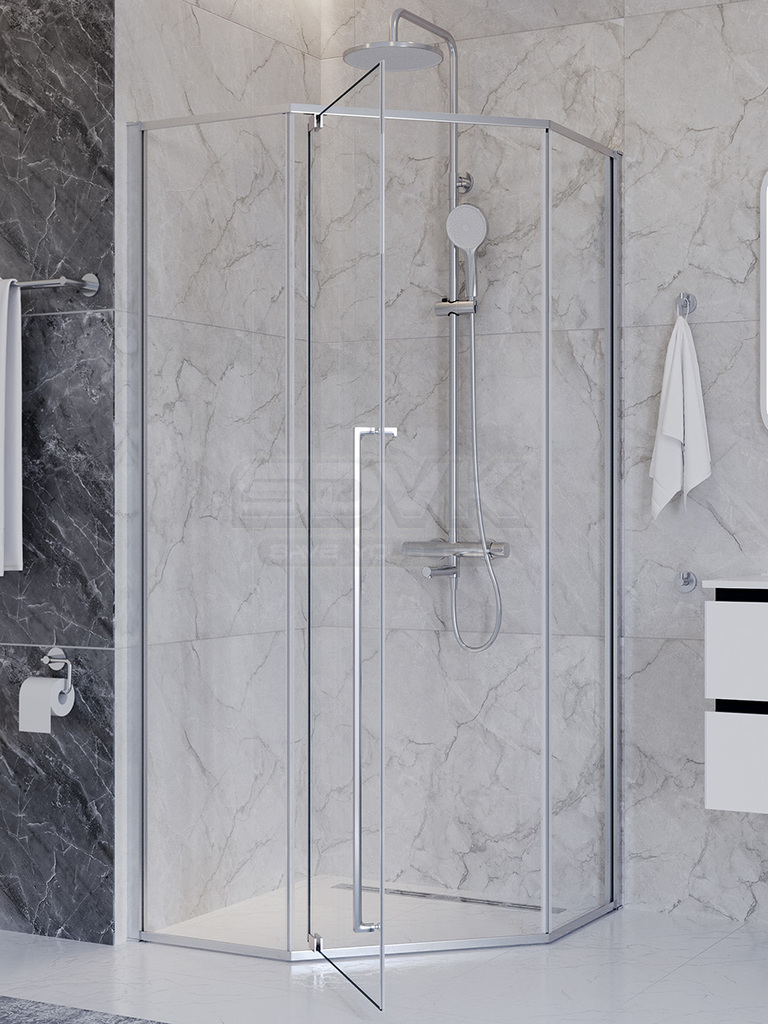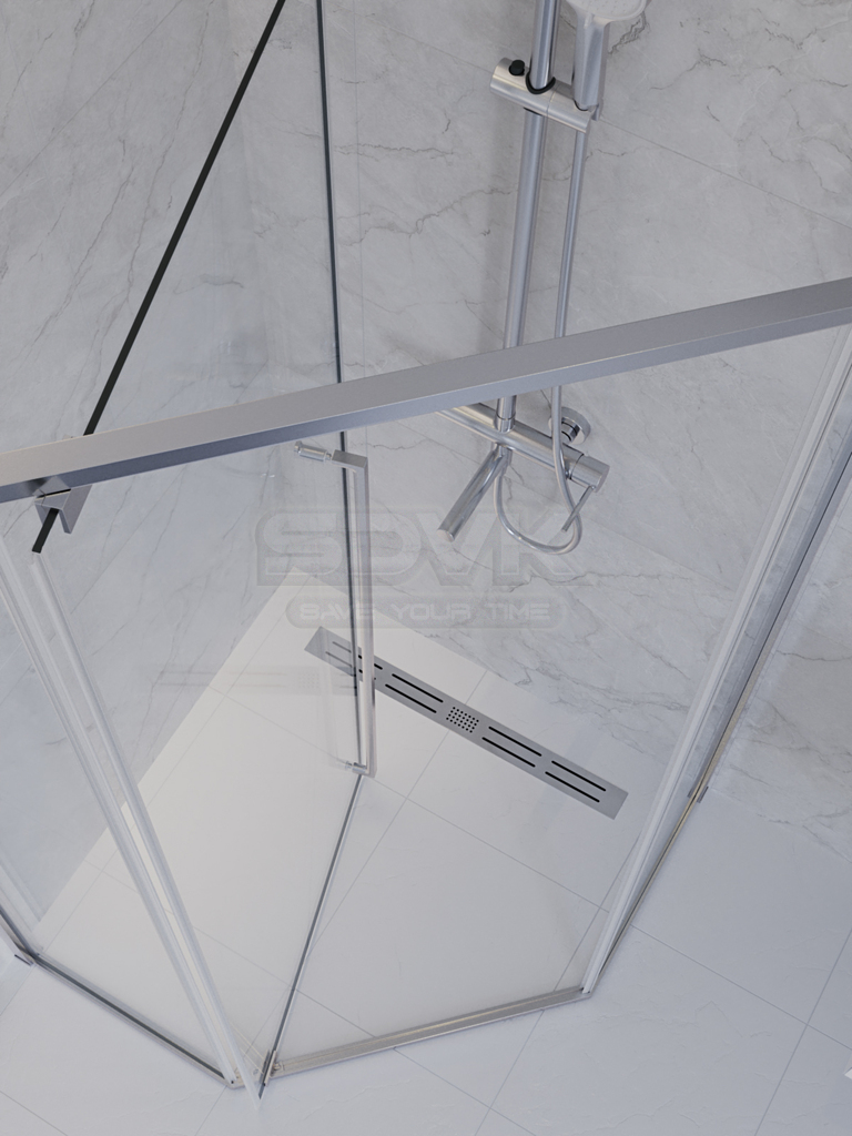Душевой уголок PLANE пятиугольной формы в классическом хромированном исполнении — это образец эргономичного дизайна и универсального стиля для современной ванной комнаты.